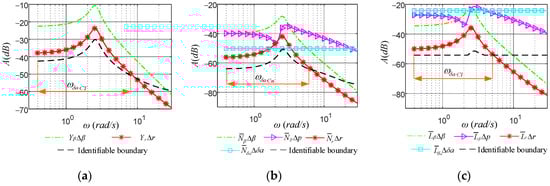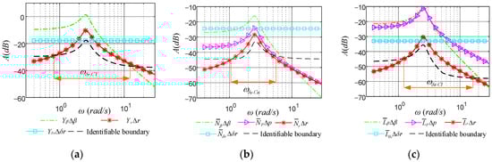 Taking directional manipulation as an example, the magnitude response curves , , , and of Δβ, Δp, Δr and with the change in rudder frequency are drawn according to the yawing moment observation equation shown in Equation (14). The amplitude response curves , , and of , , , and with the change in rudder frequency are drawn according to the rolling moment equation, drawing the amplitude response curves |YβΔβ(ω)/δr|, |YrΔr(ω)/δr|, and |YδrΔδr(ω)/δr| of YβΔβ, YrΔr, and YδrΔδr with the variation of rudder frequency according to the side force equation.