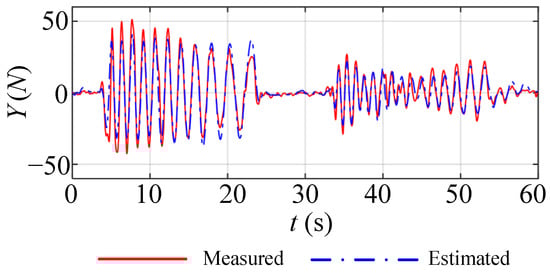 The identification results of the side force derivatives are substituted into Equation (18) to establish the side force observation model of the wind tunnel virtual flight test. Given the excitation signals used in the wind tunnel virtual flight test, the simulation results of the side force observation model, established based on the identification results, are compared with the side force data measured by the test, as shown in Figure 18. The simulation results of the identification model are in high agreement with the data measured by the wind tunnel virtual flight test, and the maximum errors of the side force curves are within 5%.