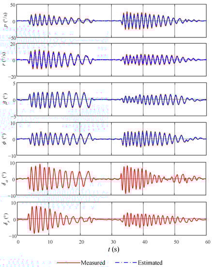 Selecting β, p, r, and ϕ as the state variables for the lateral-directional aerodynamic parameter identification, the state equation of the lateral-directional aerodynamic parameter identification model for wind tunnel virtual flight is shown in Equation (22) [].