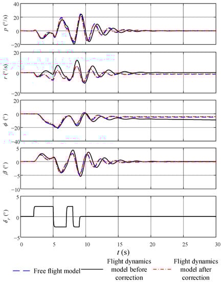 V = 30 m/s and α = 6° are selected as the steady flight state of the test model. The 3211-multipole square waves are input to the V-tail control surface, while the other control surfaces are kept fixed. Comparing the simulation results of the identified model of wind tunnel virtual flight before and after the correction with the simulation data of the free flight motion model, the results are shown in Figure 20. The motion models for both wind tunnel virtual flight and free flight are linearised motion models. It should be clarified that the free flight motion model is based on the results of traditional wind tunnel test force measurements, and the correction of the wind tunnel virtual flight motion model is obtained by eliminating the influence of the test rig.