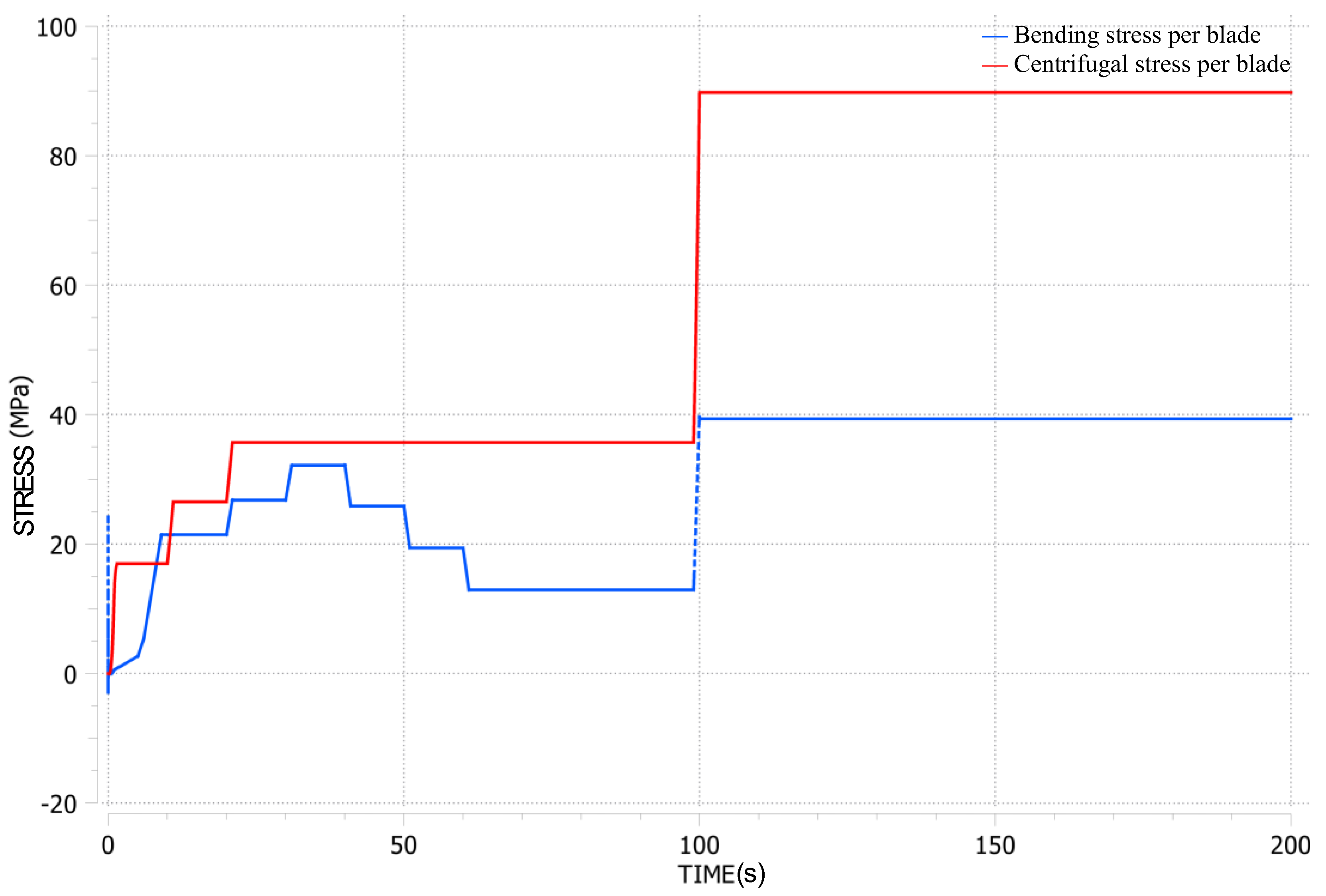 The primary stresses on the blades, including bending and centrifugal stresses, were calculated using the methodology outlined in a previous section. Figure 6 provides an example result from the transient analysis of the LUMEN FTP, utilising the Turbine Blade Fatigue module, with the highest loading conditions observed between 100 and 200 s.