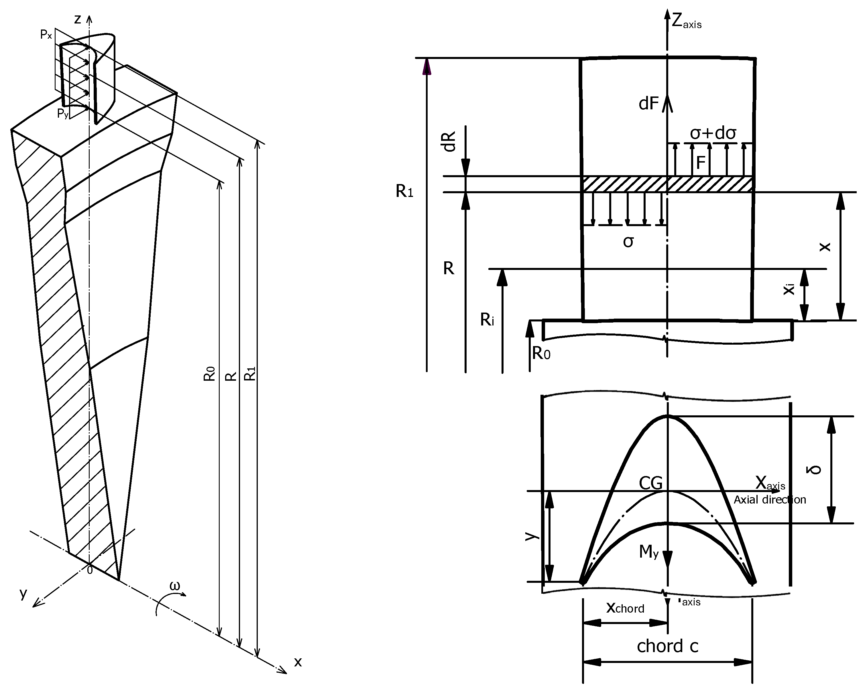 The maximum stress caused by the centrifugal force is calculated for the cross-section at the blade root, at “R0”, using the following equation: