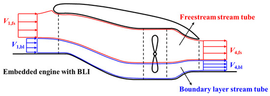 Schematic showing of flow passing through an ideal embedded engine with BLI (the freestream and boundary layer are divided into two stream tubes).