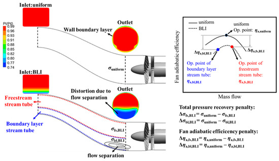 The lost power term and can be further expressed as the product of the mass flow rate and lost work, and the lost work is apparently a function of components performance. To better illustrate the effect of BLI on component performance, we use the uniform inlet condition as a reference. Figure 3 is a schematic showing the performance penalty of the S-shaped duct and fan under uniform and BLI inlet conditions. For the uniform inlet condition, the total pressure recovery of the S-shaped duct describes the loss due to the wall boundary layer. In this case, the fan is assumed to operate at the highest efficiency point, which is (black point in Figure 3). These performance parameters of the S-shaped duct and fan are used as the reference values for calculating the performance penalty due to BLI, i.e., deltas in total pressure recovery and fan adiabatic efficiency. For the BLI inlet condition, the total pressure recovery of the freestream stream tube is less than because the freestream is mixed with the separated boundary layer. Meanwhile, the total pressure recovery of the boundary-layer stream tube is also less than due to flow separation loss. Therefore, the total pressure-recovery penalty of different stream tubes and is defined as the difference between the total pressure recovery under uniform and BLI inlet conditions. In addition, the efficiency characteristic line of the fan under the BLI inlet condition will be shifted downward compared to the uniform inlet condition. In this case, the equivalent operation points of the different stream tubes (undistorted region for freestream stream tube: red point in Figure 3, distorted region for boundary-layer stream tube: blue point in Figure 3) can be determined according to the parallel compressor theory, and the equivalent operating point of the boundary -layer stream tube is closer to the small mass flow direction. Therefore, the fan adiabatic efficiency penalty of different stream tubes and are defined as the difference between the fan adiabatic efficiency under uniform and BLI inlet conditions. Therefore, the lost power can be expressed as: