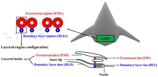 Since there is no internal flow loss due to mixing with the separated boundary layer in the freestream stream tube, a comparison of Equations (4) and (5) shows that . Therefore, the way to improve the power-saving benefit of BLI is to modify the configuration of the conventional DPS to ingest the freestream and boundary-layer separately, and this new configuration is called the LDPS (see Figure 4). The LDPS consists of an upper and lower row of propulsion systems arranged along the spanwise direction. The BLEs (boundary-layer engine) near the fuselage ingest the boundary layer, and the FSEs (freestream engine) above ingest the freestream. The layered duct is divided into FSD (freestream duct) and BLD (boundary-layer duct) by the inner lip. The FSD and BLD deliver the freestream and boundary layer to the FSF (freestream fan) and BLF (boundary-layer fan). After being pressurized by the FSF and BLF, the freestream and boundary layer are mixed in the nozzle and discharged. In LDPS, the power-saving benefit of BLI can be maximized by rationally organizing the boundary layer within the BLE. Meanwhile, the quality of the freestream is not affected by the distorted boundary layer, which can supplement the thrust. To summarize, the concept of LDPS is to maximize the aerodynamic potential of incoming flow according to its different characteristics.