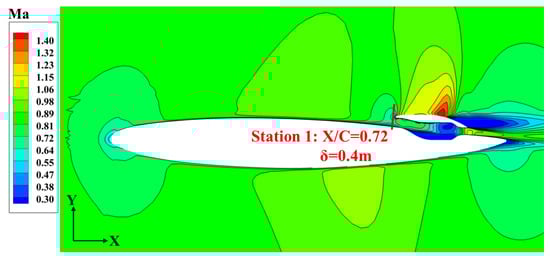 Ma contour on symmetry plane of BWB-350 with DPS at cruise (flight height of 11,000 m, Ma∞ = 0.85, angle of attack of 2°).