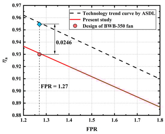 After determining the inlet conditions, the fan design parameters are required to construct the engine model of LDPS. The technology trend curve of fan design adiabatic efficiency as a function of design FPR is developed by ASDL (Aerospace System Design Laboratory) []. This trend curve reflects the fan design level from 2015 to 2025. As can be seen from the dashed black line in Figure 7, the design adiabatic efficiency of the fan varies approximately linearly with the design FPR. The current design FPR of the BWB-350 fan is 1.27, which corresponds to a design efficiency of 0.93, whereas the design efficiency corresponding to a design FPR of 1.27 would be 0.9546 according to the trend curve by ASDL. Therefore, the trend curve is shifted downward by 0.0246 to ensure that the LDPS fans are at the same design level as the BWB-350 fan. Also, this treatment can ensure that the benefit of the LDPS is not due to a higher level of fan design. Based on the above arguments, the trend curve used in the present study is the solid red line in Figure 7.