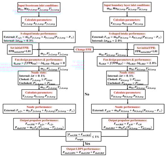 For a propulsor consisting of an S-shaped duct, a fan, and a nozzle, there exists a unique FPR of the fan that satisfies a given thrust requirement when the inlet conditions and components’ performance are determined. For the LDPS, the above arguments imply that there are a series of different combinations of the FPR of FSF and BLF that satisfy a given thrust requirement since the thrust generated by FSE and BLE can be different. Therefore, the purpose of the thrust matching procedure of LDPS is to find these different FPR combinations. Figure 8 shows the 1D engine model and the thrust matching procedure of LDPS (the left side is the FSE model and the right side is the BLE model). The 1D engine model is coded using MATLAB R2021a. The input freestream/boundary-layer inlet conditions are listed in Table 2. These parameters are first used to calculate velocity, flow area, and static pressure at the engine inlet. The performance of the S-shaped intake is divided into two parts, namely the external performance corresponding to the ram drag and the internal performance corresponding to the total pressure-recovery penalty. The total parameters at the fan entrance (station 2) are then calculated through the total parameters at station 1 and the total pressure-recovery penalty of the S-shaped duct. The iteration loop begins with setting the initial FPR value. This initial value can be chosen arbitrarily. However, the closer this value is to the convergent solution, the better the robustness of the whole loop is. After setting this initial FPR value, the fan design adiabatic efficiency is then looked up based on the trend curve in Figure 7 (the f(FPR) term in the fan design parameters and performance box). This design value minus the considered fan efficiency penalty is the final fan efficiency. The total parameters at the nozzle entrance (station 3) are then calculated through the total parameters at station 2 and the fan design parameters. The performance of the nozzle is also divided into two parts, namely the internal performance corresponding to the total pressure penalty and the external performance corresponding to the gross thrust. The state of the nozzle is determined by comparing the total pressure at station 4 with the maximum total pressure at the current ambient pressure (or by comparing the actual pressure-drop ratio with the critical pressure-drop ratio). The velocity, flow area, and static pressure at station 4 are then calculated according to different nozzle states. These parameters are used to calculate the gross thrust of the nozzle. The net thrust of the engine is defined as the gross thrust minus the ram drag, and the fan-shaft power is calculated using mass flow and total temperature at the entrance and exit of the fan. Finally, the relative error between the sum of the thrusts generated by FSE and BLE and the target thrust (12.53 kN) is checked. If this value is below 1%, then output the performance of LDPS; if not, then change the FPRs of FSF and BLF.