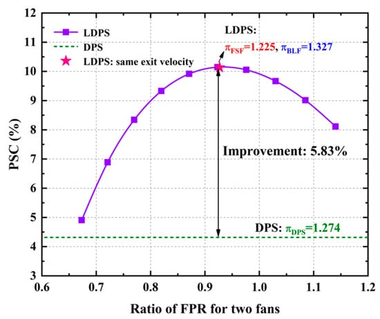 The PSC of LDPS as a function of the ratio of FPR for two fans (the PSC of DPS is displayed in green dashed line).