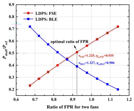 Figure 9 shows the PSC of LDPS as a function of the ratio of FPR for two fans, where the ratio of FPR for two fans denotes the ratio of the FPR of FSF to the FPR of BLF. The PSC of DPS is also displayed with a green dashed line. As the ratio of FPR for two fans increases, the PSC of LDPS first increases and then decreases. When the ratio of FPR for two fans is 0.92, the PSC reaches the maximum value, and the improvement in PSC is 5.83% compared to DPS. This trend is because, under the given mass flow and thrust requirements, the increase of the FPR of FSF leads to the decrease of the FPR of BLF. Therefore, as the ratio of FPR for two fans increases, the shaft power of FSF increases. In contrast, the shaft power of BLF decreases (see Figure 10), resulting in an optimal ratio of FPR for two fans of LDPS. In addition, the FPR of FSF is lower than DPS, and the FPR of BLF is higher than DPS under this optimal ratio (, , and ). This indicates that, in order to maximize the power-saving benefit of an embedded configuration, the fan should add more energy to the boundary layer than to the freestream.