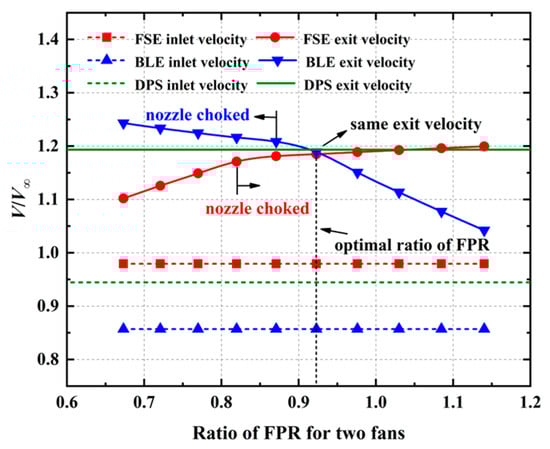 For LDPS, the different inlet conditions and FPRs of FSE and BLE result in different exit velocities. An excessive gradient in FSE and BLE exit velocity will bring additional wake mixing loss. Therefore, in addition to ensuring that the ratio of FPR for two fans of LDPS can reach the maximum PSC, the exit velocity of FSE and BLE should also be considered. Figure 11 shows the normalized inlet and exit velocities of FSE and BLE at each ratio of FPR for two fans. As the ratio of FPR for two fans increases, the exit velocity of FSE increases while the exit velocity of BLE decreases. In addition, the position where the slope of increasing exit velocity of FSE decreases means that the nozzle is choked. At this point, the slope of decreasing exit velocity of BLE increases consequently to meet the thrust requirement. It is worth noting that the exit velocity of FSE is almost the same as that of BLE under the optimal ratio of FPR for two fans. Whether it is a coincidence that the two engines have the same exit velocity under this optimal ratio of FPR for two fans can be further investigated by analyzing an ideal LDPS.