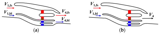 Figure 12 displays the schematic showing an ideal LDPS with different exit velocities (Figure 12a) and the same exit velocities (Figure 12b). The “ideal” means no internal flow loss in FSE and BLE. Thus, the fan-shaft power is all used to increase the mechanical power of the flow through the engine. When the nozzles are unchoked, the thrust and mechanical power of FSE and BLE for these two cases are given as: