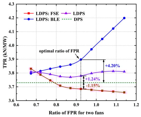 As can be seen from Figure 9, the PSC of LDPS is 5.83% higher than that of DPS under the optimal ratio of FPR for two fans. This can be explained from two aspects, namely the power-saving benefit of low inlet velocity due to BLI and the offset of additional power loss due to flow distortion. Figure 13 shows the TPR of FSE and BLE of LDPS as a function of the ratio of FPR for two fans. The TPR of DPS is also displayed in the green dashed line. When the boundary-layer flow is ingested alone by BLE, the inlet velocity of BLE is lower than that of DPS, which can be seen from Figure 11, so the TPR of BLE is improved by 4.2% compared with DPS. However, the inlet velocity of FSE is higher than that of DPS, resulting in a 1.15% drop in TPR. This shows that the power-saving benefit comes entirely from ingesting the boundary-layer flow, and ingesting the freestream flow will not bring any power-saving benefit. Overall, the comprehensive TPR of LDPS is 1.24% higher than that of DPS, which indicates that ingesting the boundary-layer flow alone can improve the power-saving potential of BLI.