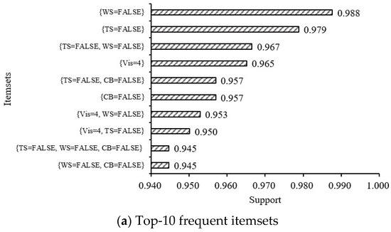 Before mining association rules, based on minimum support of 1%, the set of items that frequently occur together (i.e., frequent itemsets) are searched; Figure 9 presents the corresponding results. A total of 1,096,785 itemsets are found, of which Figure 9a shows the itemsets corresponding to the top-10-highest support values, and Figure 9b counts the number of itemsets with different itemset sizes. It can be inferred that although June and July are the most active periods of convective weather in Hong Kong, extreme weather conditions such as thunderstorms, wind shear, and cumulonimbus rarely occur, and the visibility is greater than 8 km in most periods. Based on such characteristics, in the subsequent analysis of association rules, the minimum threshold for support is also set to 1% to ensure that the rules related to extreme weather can be captured. Additionally, due to the low support threshold, a large number of itemsets are considered frequent, and the number of itemsets reaches a maximum when the size of the itemset is 7 or 8. Considering the scale of the itemsets and previous studies, this paper mainly analyzes the association rules associated with itemset sizes of 2 to 4.