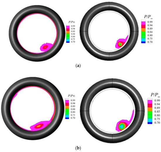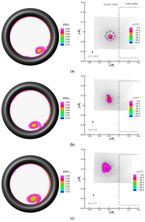 For the velocity ratio from 18.3 to 6.1, the computed pattern of the total pressure is very similar to those in the experiments. The pre-cited circumferential and radial position of the vortex also agree well with the measured data. However, the CFD results substantially underpredict the total pressure loss caused by the ground vortex at the AIP for all four conditions. The flow separation near the intake lip is also less for . The ground vortex in the CFD is even blown away when the velocity ratio increases to . However, the total pressure loss near the windward lip is overpredicted. For this case, a possible reason is that the CFD fails to present the strong velocity gradient for the ground vortex. With the absent of the ground vortex, to reach the same mass flow, the separation region near the windward lip becomes larger to account for the mass flow loss caused by the vortex. Another interesting observation is that the shape of the vortex core is more oval than that in the experiments.