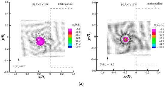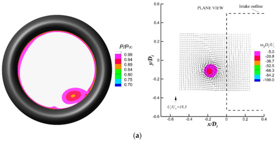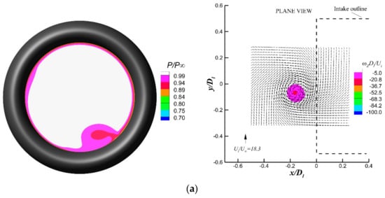where is the area of the circle. Since the vorticity is negative within the vortex core, only the negative value of is integrated. The total average non-dimensional vortex strength is obtained by dividing with the intake velocity and the diameter of the intake . Further details about the computational procedure can be found in [10].