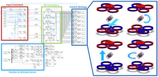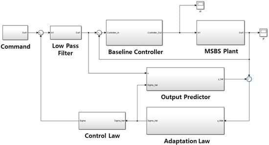 Adaptive control is a technique mainly applied to the problem of changing the operating environment or the system itself. In order to overcome the mathematical uncertainty that occurs during modeling of the system to be controlled, the structure or parameters of the control system are changed to satisfy the given performance requirements. However, high sampling frequency is required for parameter adaptation, and excessive control input can cause the actuator to saturate. L1 adaptive output feedback control does not require a model of the system to be controlled, and because it uses a low-pass filter, excessive control input is prevented and the system stability is good []. L1 adaptive output feedback controllers were constructed for each single input/output system using six independent PD controllers used in the existing MSBS simulator as baseline controllers, as shown in Figure 5.