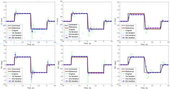 It is necessary to select a reference filter to generate a desired response waveform for each degree of freedom. For the horizontal position, the secondary vibration system step response with a natural frequency of 10 Hz and a damping factor of 0.8 was selected. For roll and pitch attitude, the natural frequency of the reference filter was changed to 20 Hz to have a faster response speed. Due to the MSBS electromagnet arrangement used in this study, the magnetic constraint force and moment are relatively weak with respect to the vertical position and yaw attitude direction. Accordingly, the natural frequencies of the reference filter were selected as 5 and 3 Hz, respectively. Figure 4 shows the result of performing IFT for position and attitude control simulation of the MSBS. It can be seen that the response of the MSBS converges to the response of the reference filter through the five-update iterations.