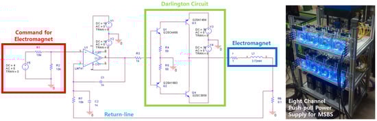 The magnitude of the magnetic force and moment generated by the MSBS is proportional to the magnitude of the electric current supplied to the electromagnet, and a current of the correct magnitude must be input to each electromagnet for precise position and attitude control. The MSBS presented in this study includes eight independent push-pull electric power supplies, in which two Darlington circuits are connected to a return-line current sensing circuit to accurately supply high current to each electromagnet. The electric circuit and the overall power supply are shown in Figure 6. Each channel of the power supply can generate up to ±10 A of electric current. The Darlington circuit has a very high current amplification rate at the output stage, and the output current can be precisely controlled through the return-line current sensing circuit. Power semiconductor devices, such as transistors used in the electric power supply, can be degraded by thermal effect due to power cycling overstress. In consequence, performance may gradually deteriorate over time, and then complete failure may occur at a specific moment []. If the correct current is not supplied to the MSBS electromagnet, the position and attitude of the test object, which is suspended in the air only depend on the magnetic field, can become unstable and a risk of a fall accident will rise. With classic control algorithms, it is difficult to maintain the initial control performance in such a situation where the system characteristics vary with time. However, when the adaptive control algorithm is applied, the change in position and attitude control performance can be minimized. In addition, even in the event of complete failure of the power supply, if there is sufficient amount of electromagnets that operate normally, secondary damage due to drop of the test object can be reduced through adaptive control allocation.