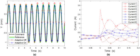 Assuming the vibration experiment was performed on a structure model exposed to aerodynamic loads in the test section of wind tunnel, simulations on control of position and attitude of the test object were performed, while a harmonic function was used as a control command. The calculations were carried out using Runge–Kutta fixed-step solver within MATLAB Simulink, and the time step was 5 ms. First, a simulation was performed for the case where the desired position in the side direction (Y), which is one of the positional degrees of freedom of the test object, was a sine wave having a frequency of 1 Hz, an amplitude of 1 mm, and the results are shown in Figure 7. Assuming a sudden performance degradation of the electric power supply, the amplification rate of the power supply for No. 3 electromagnet was reduced by 20%, and a bias current of 3 A was added from 5 s after the start of the simulation. During the initial 5 s of the simulation, it was observed that the command following performance did not differ significantly depending on whether the adaptive control algorithm was activated or not. However, it can be seen that from 5 s after the failure of the electric power supply, a noticeable difference occurs in the command following performance according to the application of the adaptive control algorithm.