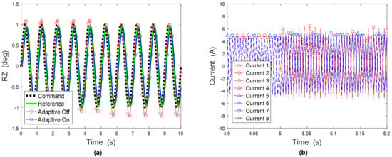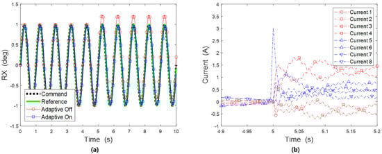 The next simulation was performed for the case where the desired attitude in the roll direction (RX), one of the rotational degrees of freedom of the test object, was a sine wave with a frequency of 1 Hz and an amplitude of 1 deg, and the results are shown in Figure 8. Similarly, the amplification rate of the power supply for the No. 8 electromagnet was reduced by 20% at 5 s after the start of the simulation, while a bias current of 3 A was added assuming a sudden performance degradation. As in the previous simulation, there is no significant difference in the command following performance before the failure of the power supply occurred. However, after the failure, it can be confirmed that the control system with adaptive algorithm shows better performance than the simple PD controller.