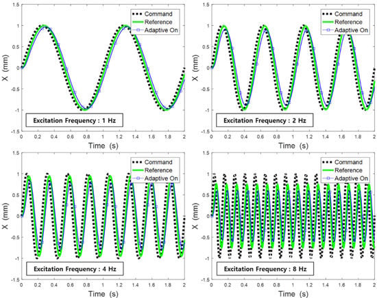 As described above, there is generally no intuitive lower bound when selecting the bandwidth of the low pass filter included in the L1 adaptive output feedback algorithm. In order to precisely perform the vibration test using MSBS, the bandwidth should be selected in consideration of the frequency of harmonic excitation input as a position and attitude control command. Figure 10 shows the simulation results according to the frequency change of harmonic excitation. In case of excitation with a frequency of 1 Hz, both the reference model, the secondary vibration system with a natural frequency of 10 Hz, and the MSBS follow the command well. However, it can be seen that the command following performance decreases as the frequency of harmonic excitation increases. In addition, the reason that the performance of MSBS is relatively lower than that of the reference model is because the upper bound of the bandwidth of the LPF included in the position and attitude control system of the MSBS is lower.