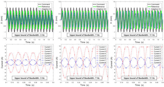 Harmonic excitation simulations with frequency of 8 Hz were performed to compare the command following performance according to the change in bandwidth of the low pass filter, and the results are shown in Figure 11. It was observed that the command following performance improved as the upper bound of the bandwidth was increased from 3 Hz, but it was confirmed that the performance was rather lowered at 11 Hz or higher. It is necessary to consider the actuator characteristics when selecting the upper bound of bandwidth of the low pass filter so that excessive response does not occur. The magnitudes of the electric currents, shown in Figure 11, indicate that the command following performance of the MSBS can be deteriorated as excessive control commands are saturated by the limitation of the electric power supply.