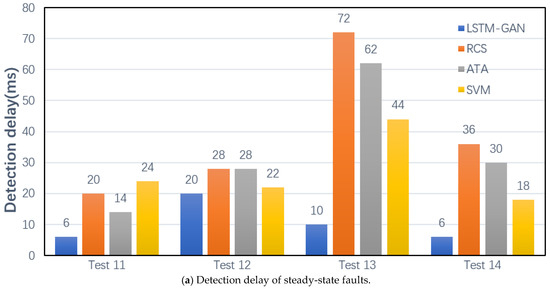 In most cases, the LSTM-GAN having a sample size of 10 × 24 performs well. Thus, we compared it with RCS, ATA, and SVM, as shown in Figure 7. It can be seen that the detection delay of LSTM-GAN on other test sets is significantly lower than that of RCS, ATA, and SVM, except that the detection delay of test 16 is higher than that of SVM. Therefore, compared with RCS, ATA, and SVM, LSTM-GAN performs better in terms of timeliness.
