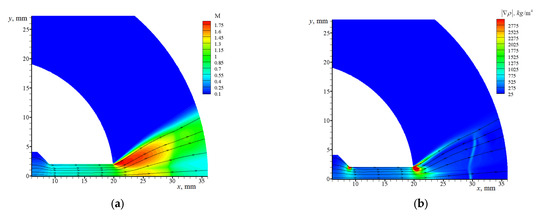 The supersonic flow in the slot space is limited on the right by the shock wave (see Figure 5b). In the case when the deceleration force acting from the side of the disks is neglected (), the flow in the channel and in the slot space proves to be supersonic (see the dashed line in Figure 5a).
