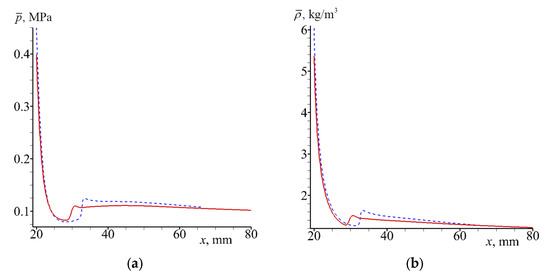 The coordinates of shock waves in the gas jet and the two-phase jet in Figure 17 are close to each other, . It is seen that behind the shock wave (), the pressure and density vary slightly ( and ), and the velocity rapidly decreases with increasing coordinate . The jet width of the gas–particle mixture increases linearly, and the exponential expansion of the stationary gas jet width without particles take place.