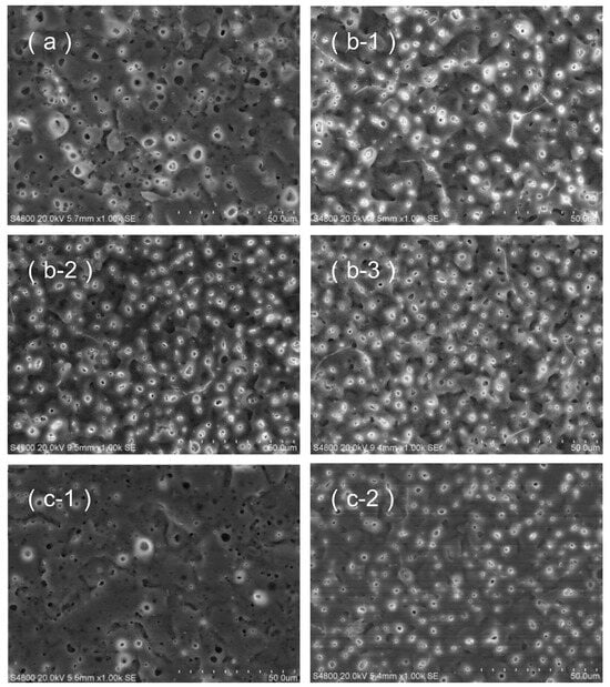 SEM images of MAO coatings in electrolytes with different concentrations of carbohydrates: (a) 0 g/L; lactose: (b-1) 5 g/L, (b-2) 10 g/L, and (b-3) 15 g/L; starch: (c-1) 5 g/L, (c-2) 10 g/L, and (c-3) 15 g/L; and dextrin: (d-1) 5 g/L, (d-2) 10 g/L, and (d-3) 15.