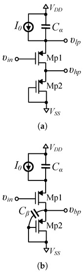 In order to reduce the MOS transistor count, the proposed topology is demonstrated in Figure 2a []. Considering that transistors Mp1-Mp2 are matched, with transconductance parameter equal to , the derived transfer functions are: