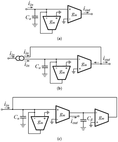 The implementation of current-mode low-pass and high-pass filters, using OTAs as active elements, is demonstrated in Figure 3a,b, where the topologies implement the transfer functions in (14) and (15), respectively. The implementation of the band-pass filter is performed by the topology in Figure 3c, which realizes the transfer function in (13).