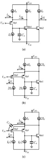 The proposed current-mode low-pass filter structure is depicted in Figure 4a. Applying the Kirchhoff’s current law (KCL) at the input terminal and taking into account the current-mirror operation, implemented by transistors Mn1–Mn2, it is derived that