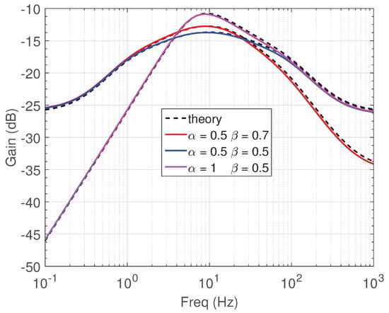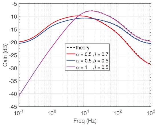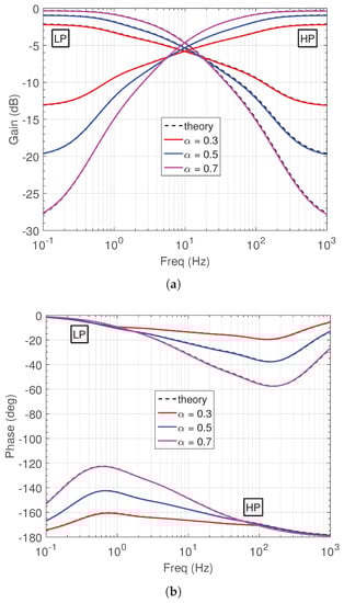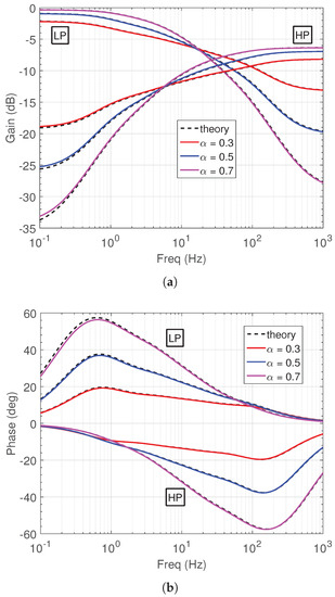 Owing to the interdisciplinary nature of fractional-order calculus [,,], the development of fractional-order filters has gained a significant research interest because of the offered more precise gradient of the transition from pass-band to stop-band, with regards to their integer-order counterparts. This originates from the fact that the slope of the attenuation of an order filter, with n integer and , is equal to dB/Oct., instead of dB/Oct. slope realized by the corresponding integer-order filters []. Another benefit of the fractional-order filters is their capability of performing scaling of the realized time-constants due to their dependence on the order of the filter. This is a very attractive feature in the case of biomedical applications, where very large values of time-constants are required [].
