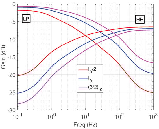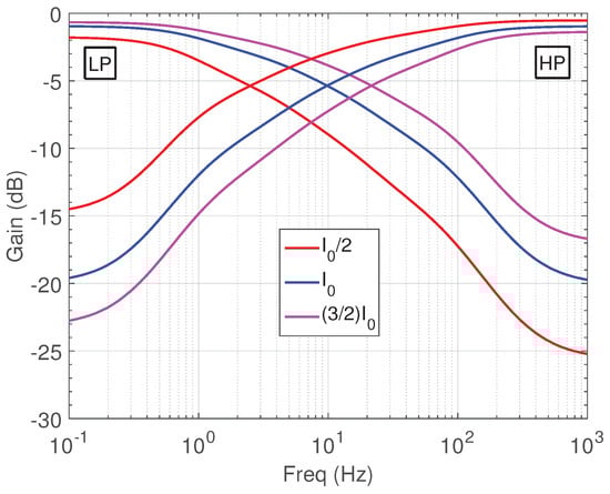 The electronic tuning capability of the filters for is demonstrated in Figure 11, where for bias currents nA, for the low-pass filter the corresponding half-power frequencies were Hz, while for the high-pass filter the derived half-power frequencies were Hz. These results are close to the results Hz and Hz, which are derived according to (30).