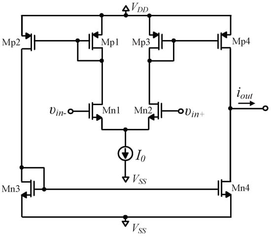 Considering that is the transconductance of Mn1–Mn2, the output current is expressed as