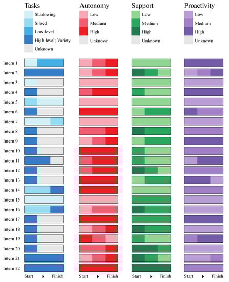 Of the 22 interns, 17 experienced high-level autonomy at some point in the year (Figure 2). Furthermore, most of these interns started with lower levels of autonomy at the beginning of the year, which increased to high levels by the end of the year. For example, after three months in her internship, one candidate described the high level of autonomy her principal mentor now provided her: