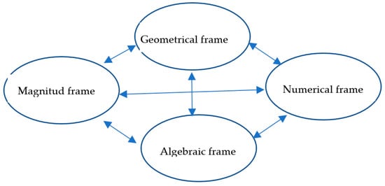 In addition to these, (, as cited in ) propose the functional algebraic frame, which involves “formulas that express area in terms of lengths related to geometric figures.” According to the authors, the first three frames proposed by () allow for the analysis of situations in which the concept of area is understood as a one-dimensional magnitude. However, “area is also a two-dimensional magnitude in relation to length, and when the relationship between these two geometric magnitudes is addressed more directly, it becomes necessary to include length—like area—as an object within the frame of magnitudes” (). In this sense, it would be coherent to also consider the formulas that express area as a function of lengths related to geometric surfaces—what the authors term the functional algebraic frame. This expanded model could thus be represented as follows in Figure 1: