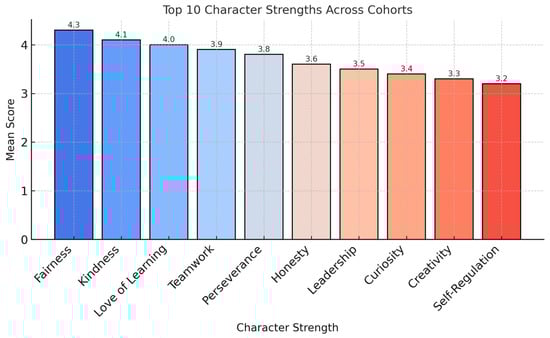 The analysis of the VIA Inventory revealed a consistent pattern of character strengths across the four cohorts. When considering the entire sample, the most prominent strengths were fairness, kindness, love of learning, teamwork, and perseverance (see Figure 3).