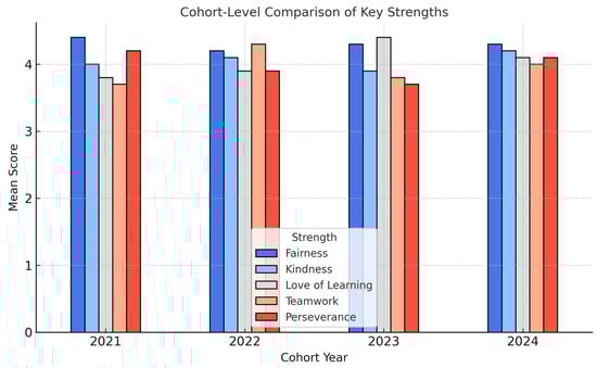 Cohort-level comparisons indicated minor but noteworthy differences: teamwork was more salient in the 2022 cohort, while love of learning became more pronounced in the 2023 group, and the 2024 cohort displayed a more balanced strengths profile. These variations suggest that contextual and temporal factors may influence the prominence of certain strengths (; ).