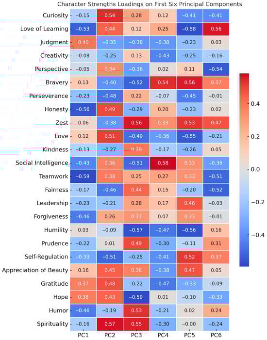 To explore these interrelationships more systematically, a principal component analysis (PCA) was conducted. The results indicated that the 24 strengths could be grouped into a smaller number of latent dimensions, largely aligning with the six higher-order virtues proposed by (). For instance, strengths such as curiosity, creativity, and love of learning loaded together on a component corresponding to wisdom, while teamwork, kindness, and fairness clustered under humanity and justice (see Figure 5).