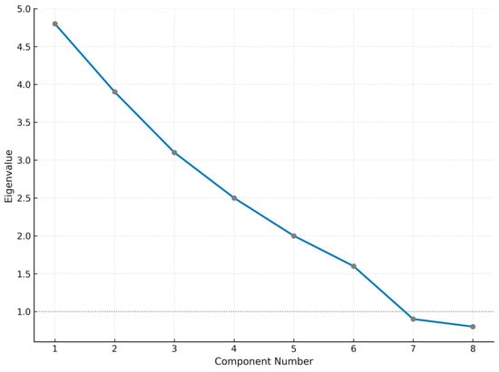 Scree Plot of Principal Component Analysis (PCA) for eight components. Note. Components with eigenvalues greater than 1 were retained, supporting a six-factor solution.