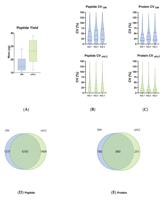 The uHLC workflow had higher reproducibility than the OM workflow, as shown in the lower CVs at the protein level (Figure 2B), with median CV of 15.6–20% in the uHLC and 28–34.7% in the OM workflows, respectively. Similarly, at the peptide level (Figure 2C), median CV of 20.2–24.7% in the uHLC and 36.2–44% in the OM workflows were observed. PCA analysis also showed a tighter clustering of technical replicates in the uHLC workflow, indicating improved reproducibility compared to the OM workflow (Figure 2F). The workflows showed a similar total protein and peptide coverage across all replicates. A large overlap was observed between the two methods, with 7711 and 7477 peptides identified (Figure 2D), which corresponded to 1141 and 1070 protein identifications for the uHLC and OM workflows, respectively (Figure 2E) (Supplementary File S1: peptide and protein lists).