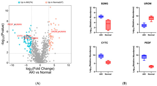 Data analysis of the urinary proteome revealed the presence of many proteins reported in the literature as candidate biomarkers of renal dysfunction. Selected known markers showed differential abundance between cases and controls (Figure 4A,B). The PCA analysis showed a distinct clustering of the limited number of AKI and normal participants based on quantitative proteomic data (Figure 4C).