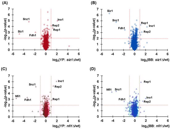 Volcano plots indicating differential protein abundance in knockout strains compared to wild-type (wt). The comparisons with respect to wild-type are (A) siz1Δ with Y-PER (YP) protein extraction, (B) siz1Δ with bead-based lysis (BB), (C) nfi1Δ with Y-PER protein extraction, and (D) nfi1Δ with bead-based lysis. Labels identify prominent proteins with significant changes in abundance.