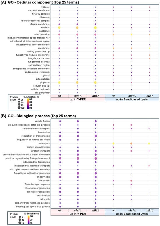 Gene Ontology (GO) enrichment analysis of differentially abundant proteins. (A) Top 25 cellular component terms and (B) top 25 biological process terms enriched in proteins upregulated in Y-PER and bead-based lysis extracted samples in wild-type (wt), siz1Δ, and nfi1Δ strains. Dot size represents protein count, and color indicates percent enrichment.