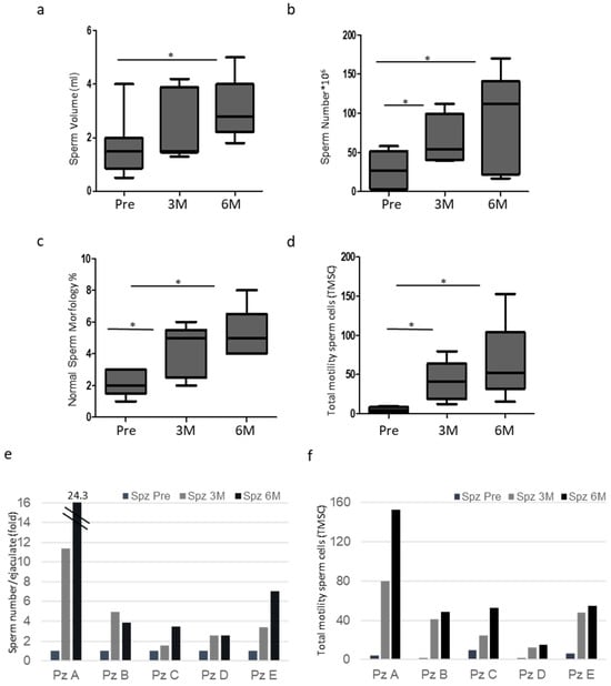 (a) Sperm volume of ejaculates from patients Pre, 3 (3M) and 6 months (6M) after surgery. Box plots are shown (N = 5, * p < 0.05, one-way ANOVA). (b) Total sperm number of ejaculates from patients Pre, 3 (3M) and 6 months (6M) after surgery. Box plots are shown (N = 5, * p < 0.05, one-way ANOVA). (c) Normal sperm morphology (%) of ejaculates from patients Pre, 3 (3M) and 6 months (6M) after surgery. Box plots are shown (N = 5, * p < 0.05, one-way ANOVA). (d) Total motility sperm cells (TMSC) of ejaculates from patients Pre, 3 (3M) and 6 months (6M) after surgery. Box plots are shown (N = 5, * p < 0.05, one-way ANOVA). (e) Total sperm number of matched samples in ejaculates from patients Pre, 3 (Spz 3M) and 6 months (Spz 6M) after surgery. The value of each patient’s pre-sperm sample is arbitrarily set to 1. (f) Total motility sperm cells (TMSC) of matched samples in ejaculates from patients Pre, 3 (Spz 3M) and 6 months (Spz 6M) after surgery.