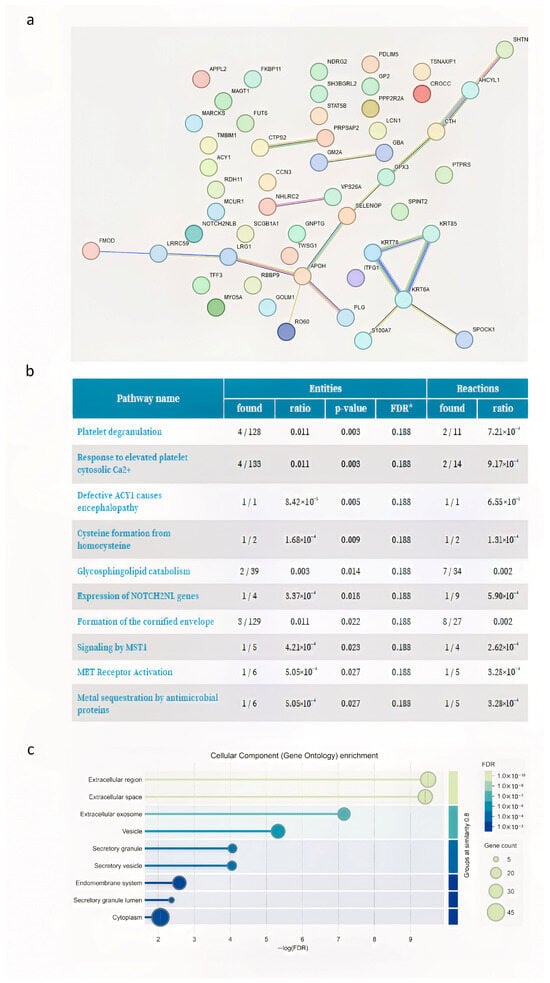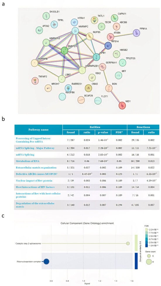 For the STRING analysis, we used a minimum required interaction score of 0.7 (high confidence) to construct the protein–protein interaction (PPI) network. The network was further filtered to include only experimentally validated and database-annotated interactions. For the Reactome pathway enrichment analysis, default settings were used, with a significance threshold of FDR < 0.05.