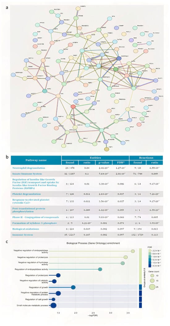 The study observed a significant increase in proteins involved in antioxidant defense, specifically thioredoxin (TXN) and thioredoxin-dependent peroxide reductase 3 (PRDX3) after surgery (Supplementary Files S3 and S4). Moreover, STRING analysis highlighted that many of the upregulated proteins were connected with SERPINA5, CRISP3, KLK proteins and EPHX2. Reactome clustering pathway analysis (Figure 4b) of DAP-upregulated proteins was performed. The most representative enriched pathways were those linked to “neutrophil degranulation, platelet degranulation, and platelet degranulation in the major pathway of response to elevated platelet cytosolic Ca2+”. According to the classification for biological process (gene ontology) (Figure 4c), the main upregulated proteins are predominantly represented by negative regulation of endopeptidase activity, negative regulation of hydrolase activity, and negative regulation of proteolysis (CST4, TIMP2, CSTB, SERPINF2, SERPINA5, SPINT1, WFDC2, RPS6KA3, SERPINB1, CST3, and SERPINA1). These proteins are involved in vesicular trafficking and endopeptidase activities.